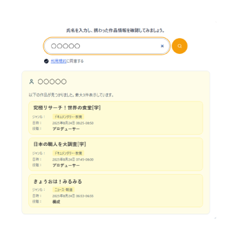 スキルみるなら、お名前を入力するだけであなたが携わった作品をリスト化します。また、無料登録で、リストのダウンロードなどすべての機能を利用できるようになります。